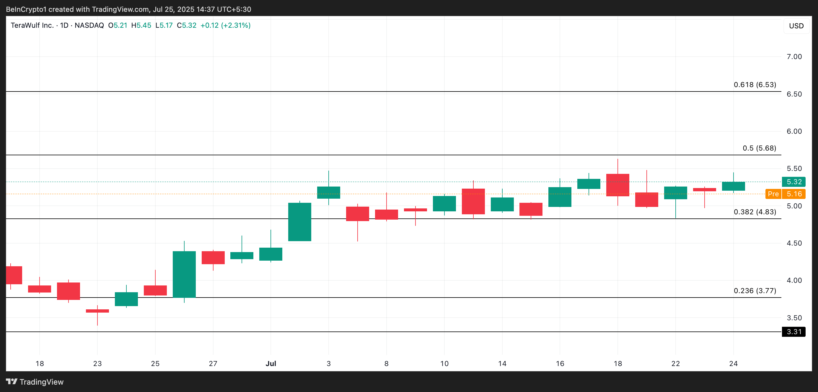 ในช่วงก่อนตลาดวันนี้ WULF ซื้อขายที่ 5.16 USD หากแรงกระตุ้นขาขึ้นเพิ่มขึ้นเมื่อเปิดตลาด หุ้นอาจพุ่งไปที่แนวต้านที่ 5.68 USD