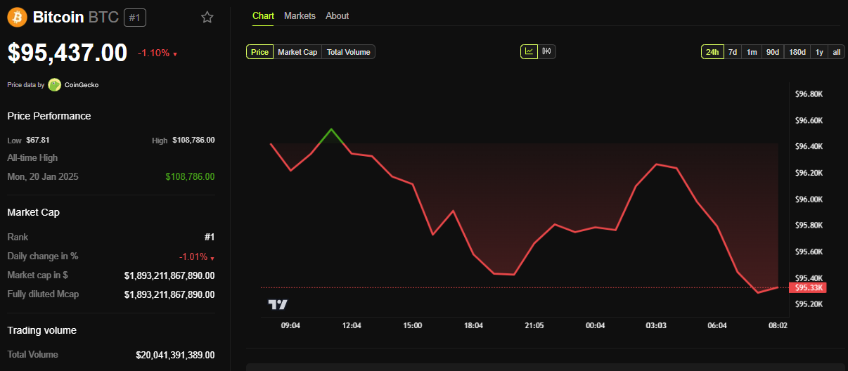 ข้อมูลจาก BeInCrypto แสดง ว่า Bitcoin ซื้อขายอยู่ที่ 95,437 USD ณ เวลาที่เขียนนี้ ลดลง 1.1% ตั้งแต่เปิดการซื้อขายในวันจันทร์