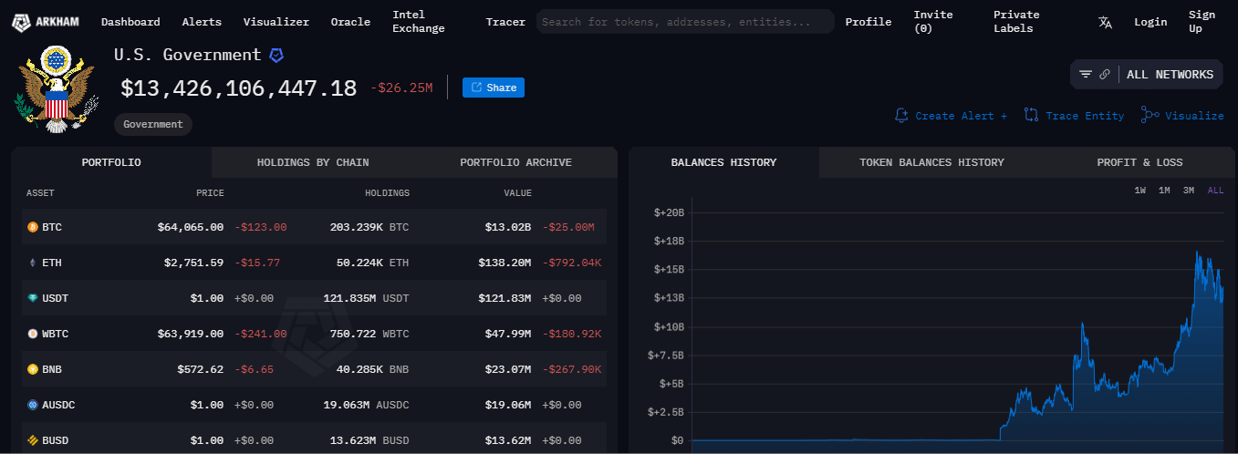 การถือครอง Bitcoin ของรัฐบาลสหรัฐฯ ยังคงเป็นข้อกังวลที่สําคัญสําหรับตลาด จากข้อมูลของ Arkham Intelligence ปัจจุบันรัฐบาล ถือครองประมาณ 203,239 BTC การโอนเงินจํานวนมากจากสินค้าคงคลังนี้อาจทําให้เกิดความกลัวว่าจะมีอุปทานล้นตลาด ซึ่งอาจผลักดันให้ราคาของ Bitcoin ต่ํากว่าระดับ 60,000 ดอลลาร์