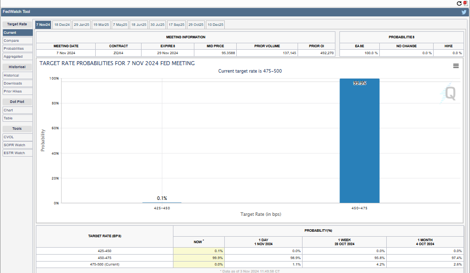 ด้วยการประชุมที่เหลือเพียงเดือนพฤศจิกายนและธันวาคม มีแนวโน้มว่าจะมีการลดอัตราดอกเบี้ย 25 จุดพื้นฐานสองครั้งที่กำลังจะเกิดขึ้น ในบริบทนี้ เครื่องมือ CME Fed Watch แสดงความน่าจะเป็น 99.9% ของการลดอัตราดอกเบี้ย 25 จุดพื้นฐานในการเปิดเผยข้อมูลเศรษฐกิจของสหรัฐฯ ในวันพฤหัสบดี