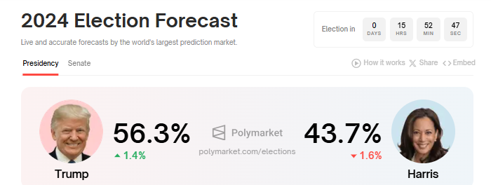 ตลาดสหรัฐฯ กำลังเข้าใกล้จุดสุดยอดของการแข่งขันทางการเมืองระหว่าง Donald Trump และ Kamala Harris จากพรรครีพับลิกันและพรรคเดโมแครตตามลำดับ ในวันอังคารที่ 5 พฤศจิกายน ตามข้อมูลจาก Polymarket การเลือกตั้งสหรัฐฯ จะเกิดขึ้นในไม่กี่ชั่วโมง โดย Trump มีคะแนนนำเล็กน้อย