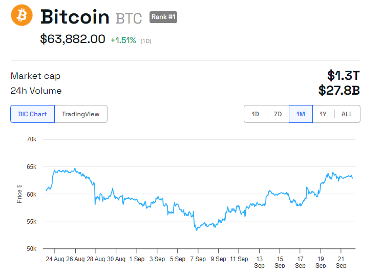 สำหรับ Bitcoin สภาพแวดล้อมที่มีอัตราดอกเบี้ยต่ำและสภาพคล่องที่มากขึ้นมักจะเป็นผลดี เนื่องจากนักลงทุนมักจะหันไปใช้สินทรัพย์ที่มีความเสี่ยงสูงในช่วงเวลาดังกล่าว ข้อมูลจาก BeInCrypto แสดงว่า Bitcoin มีราคา USD 63,882 ณ เวลาที่เขียน ขึ้น 1.51% นับตั้งแต่เริ่มต้นเซสชั่นวันจันทร์