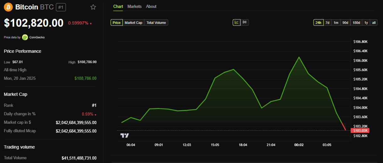 ณ ขณะที่เขียนนี้ Bitcoin ซื้อขายที่ 102,820 USD ลดลง 0.5% ใน 24 ชั่วโมงที่ผ่านมา
