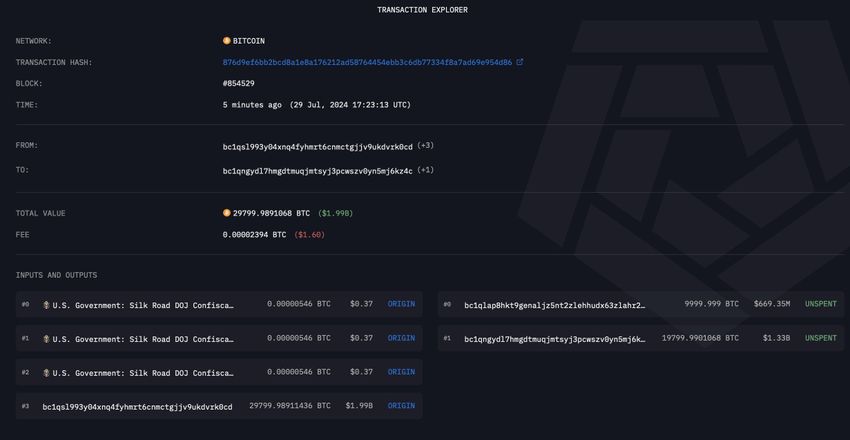 จากข้อมูลของ Arkham ในขั้นต้น รัฐบาลสหรัฐฯ ได้โอน Bitcoins เหล่านั้นเพื่อระบุ bc1qs ประมาณหนึ่งชั่วโมงหลังจากการทําธุรกรรมนี้ สินทรัพย์เหล่านี้ถูกแบ่งระหว่างที่อยู่สองแห่ง คนแรกได้รับ 10,000 BTC มูลค่า 669.35 ล้านดอลลาร์ ในขณะที่คนที่สองได้รับ 19,800 BTC มูลค่า 1.33 พันล้านดอลลาร์