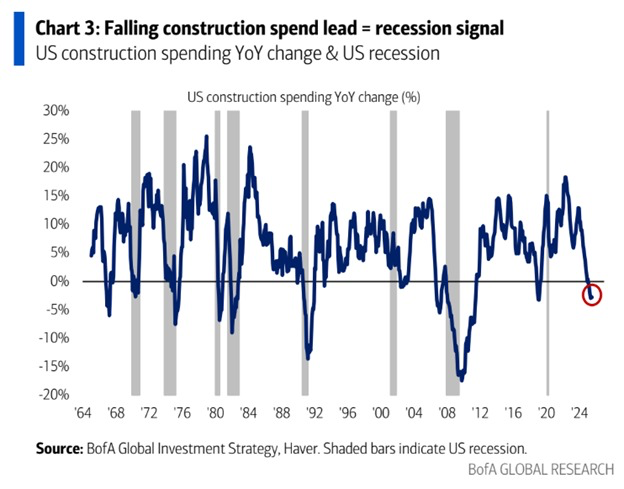 สัญญาณที่น่ากังวลอีกประการหนึ่งคือการลดลงอย่างมากของการใช้จ่ายในการก่อสร้าง The Kobeissi Letter ชี้ให้เห็นว่าตัวเลขในเดือนกรกฎาคม 2025 แสดงให้เห็นว่าลดลง 2.8% เมื่อเทียบกับปีที่ผ่านมา