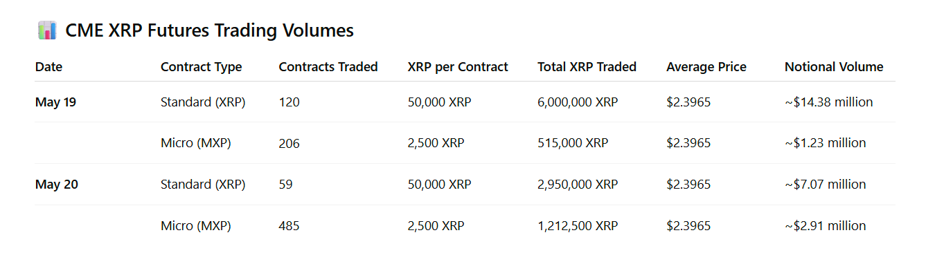 ตามข้อมูลอย่างเป็นทางการของ CME และรายงานที่ยืนยัน มีการซื้อขายสัญญามาตรฐาน 120 สัญญาและไมโคร 206 สัญญาในวันที่ 19 พฤษภาคม รวมประมาณ 6.5 ล้าน XRP