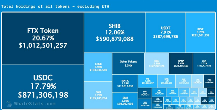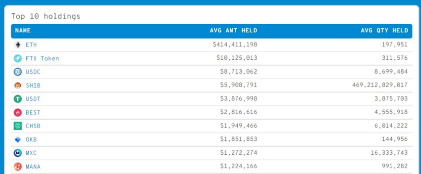 นอกเหนือจากโทเค็น FTX และ Ethereum แล้ว สินทรัพย์หลักอื่น ๆ ที่มีอัตราการถือครองสูงบน Ethereum ได้แก่ Shiba Inu, Tether, BEST, Decentraland (MANA), SwissBorg (CHSB), OKB และ MXC