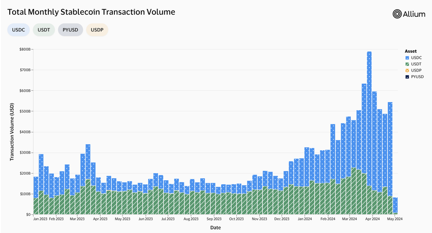 ตั้งแต่ต้นปี 2024 USDC ครอง 50% ของธุรกรรมทั้งหมด แนวโน้มนี้นับเป็นการเปลี่ยนแปลงที่สําคัญจากการเปลี่ยนแปลงของตลาดก่อนหน้านี้ ซึ่ง USDT ถือเป็น Stablecoin ที่โดดเด่น แม้ว่า USDT จะมีอํานาจเหนือกว่า 69% ตามที่ รายงาน โดย DefiLlama แต่ประสิทธิภาพของ USDC ก็โดดเด่น