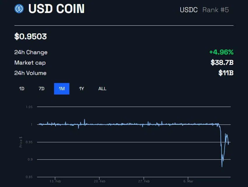 ตามข้อมูลของ BeInCrypto พบว่า USDC เกือบจะสามารถกลับมามีราคาซื้อขายได้ตามหมุดราคาที่เหรียญละ 1 ดอลลาร์สหรัฐฯ ตามคำสัญญาของ Circle แต่ราคาเหรียญกลับมาอยู่ที่ 0.95 ดอลลาร์สหรัฐฯ ณ เวลาที่เขียนข่าวต้นฉบับ