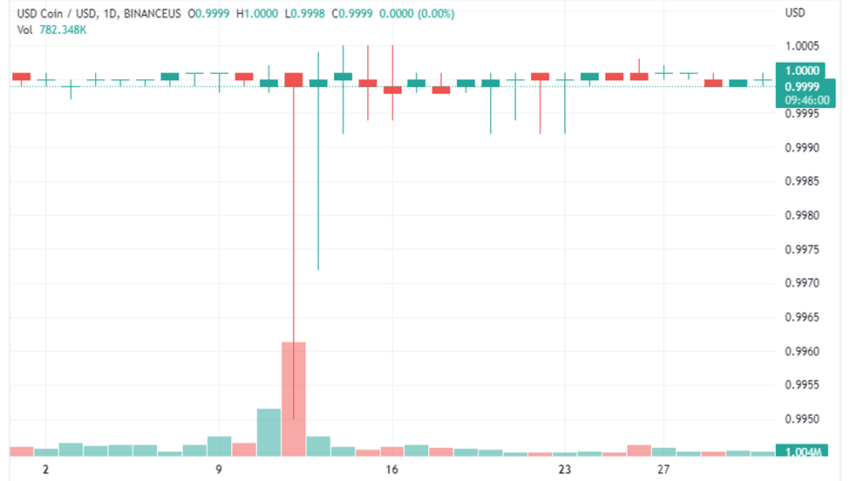 USDC เปิดราคาเมื่อวันที่ 1 พฤษภาคมที่ 1 ดอลลาร์ แตะระดับสูงสุดรายเดือนที่ 1.01 ดอลลาร์ในวันที่ 12 พฤษภาคม ทดสอบระดับต่ำสุดรายเดือนที่ 0.9993 ดอลลาร์ในวันที่ 10 พฤษภาคม และปิดเดือนที่ราคาซื้อขายที่ 1 ดอลลาร์ โดยรวมแล้ว ไม่มีการเปลี่ยนแปลงใดๆ ในราคาเปิดและปิดของโทเค็นดังกล่าวในเดือนพฤษภาคม