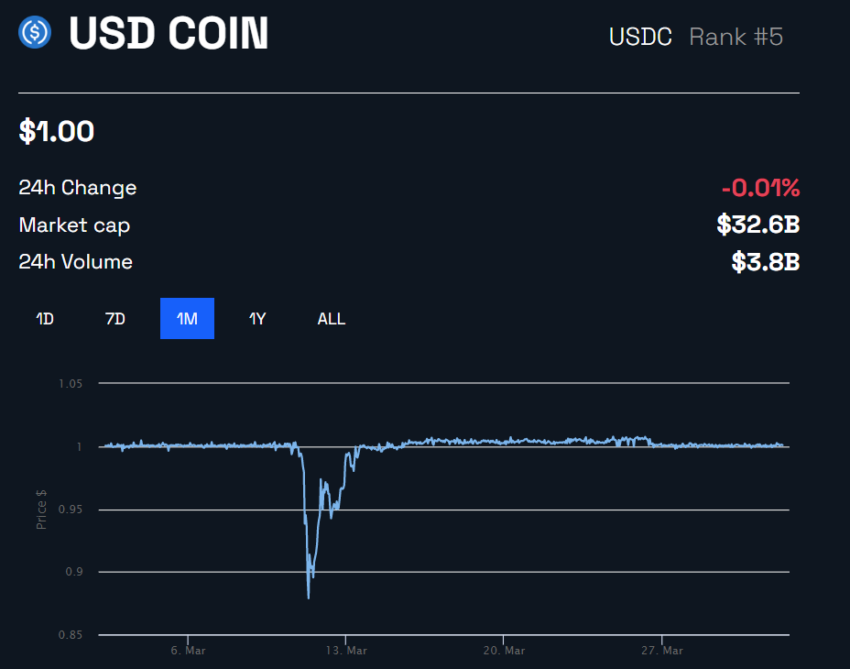 ปัญหาของ USDC เริ่มขึ้นเมื่อวันที่ 11 มีนาคม 2023 เมื่อมีการเปิดเผยว่าทุนสำรองจำนวน 3.3 พันล้านดอลลาร์สหรัฐของบริษัทนั้นเก็บไว้ที่ธนาคาร Silicon Valley Bank ซึ่งเป็นมิตรกับบริษัทคริปโต เมื่อข่าวดังกล่าวแพร่สะพัด ทำให้มูลค่าของ USDC ลดลงต่ำสุดที่ 0.87 ดอลลาร์สหรัฐฯ
