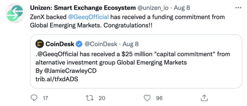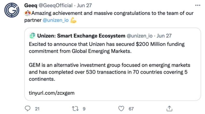 เมื่อวันที่ 8 สิงหาคม Geeq ได้รับเงินทุนจำนวน 25 ล้านดอลลาร์จากกลุ่มการลงทุนทางเลือก Global Emerging Market ภาระผูกพันด้านเงินทุนจาก GEM ได้รับการออกแบบมาเพื่อปล่อยเงินทุนเมื่อบรรลุเป้าหมายด้านประสิทธิภาพ มันชวนให้นึกถึงเงิน 200 ล้านดอลลาร์ที่จัดสรรให้กับ CeDeFi Unizen บน Twitter เราจะเห็นว่าการแลกเปลี่ยนเหล่านี้คือความน่ายินดี