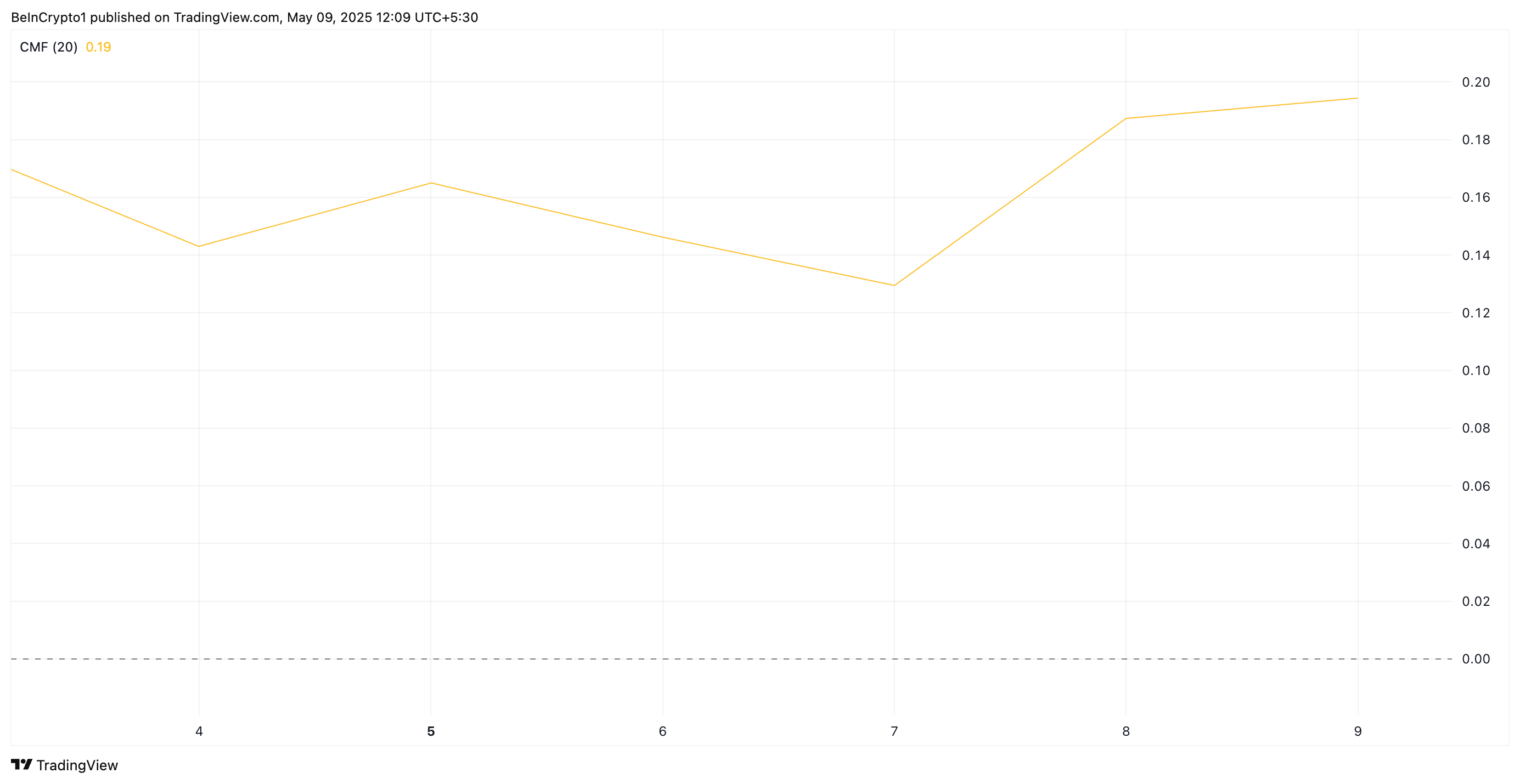 นอกจากนี้ Chaikin Money Flow (CMF) ที่เพิ่มขึ้นของ altcoin ยังสนับสนุนมุมมองที่เป็นบวกนี้ ณ เวลานี้ ตัวชี้วัดโมเมนตัมอยู่เหนือเส้นศูนย์ที่ 0.19 บ่งชี้ถึงแรงซื้อที่สูง