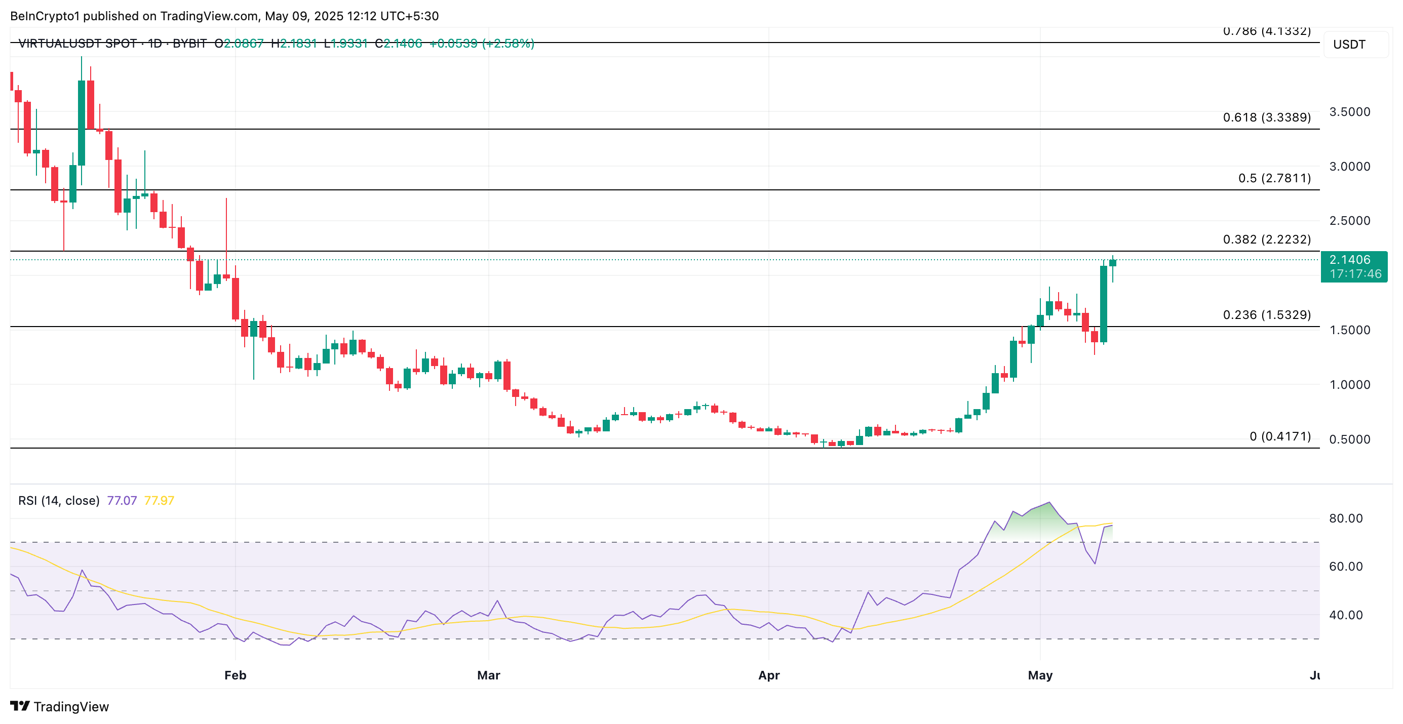 อย่างไรก็ตาม แม้ว่ามุมมองเชิงบวกยังคงอยู่ แต่ควรระมัดระวัง ดัชนีความแข็งแกร่งสัมพัทธ์ (RSI) ของ VIRTUAL ได้ถึงระดับที่ซื้อมากเกินไป ซึ่งบ่งชี้ว่าอาจมีการปรับฐานของตลาดในอนาคต