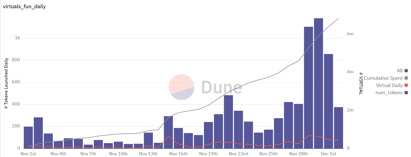ตามข้อมูลจาก Dune มีการสร้าง AI Agent tokens กว่า 21,000 รายการบน Virtuals Protocol ในเดือนพฤศจิกายนเพียงเดือนเดียว โดย tokens อย่าง AIXBT และ LUNA เพิ่มขึ้นกว่า 300% ภายในไม่กี่วันหลังเปิดตัว