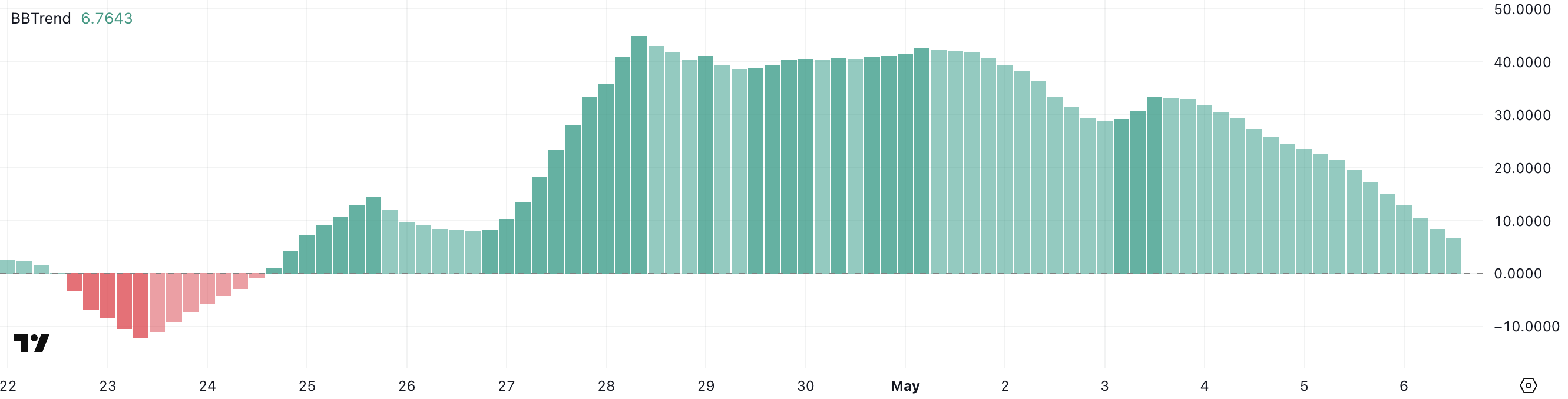 ค่าปัจจุบันที่ 6.76 ยังคงสะท้อนถึงแนวโน้มบวก แต่การลดลงอย่างรวดเร็วแสดงให้เห็นว่าแรงผลักดันกำลังเย็นลง แม้ว่านี่จะไม่จำเป็นต้องบ่งบอกถึงการกลับตัวที่ใกล้เข้ามา แต่ก็แสดงให้เห็นว่าอัตราการเติบโตที่ระเบิดในช่วงไม่กี่วันที่ผ่านมากำลังชะลอตัวลง
