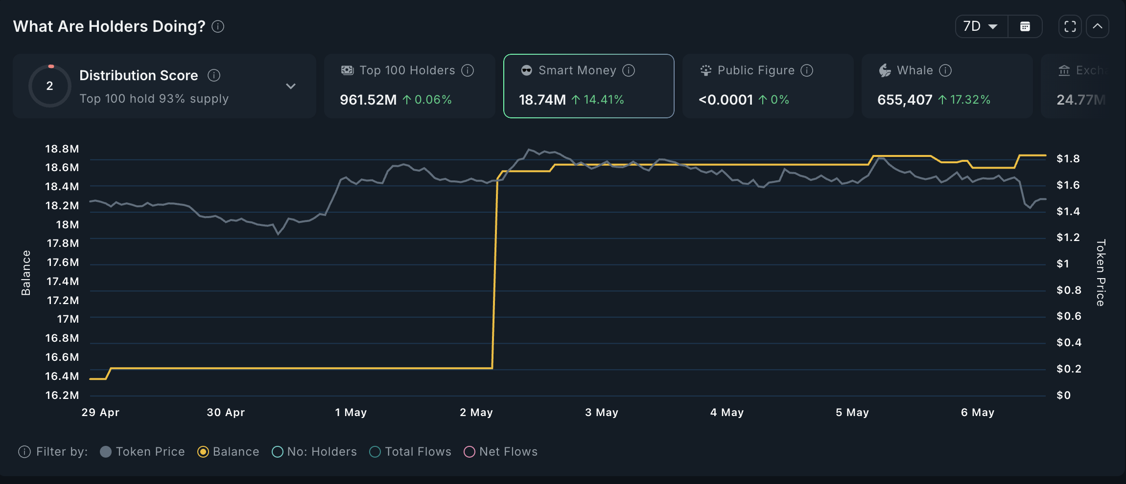 จำนวน โทเคน VIRTUAL ที่ถือโดยกระเป๋าเงิน Smart Money บน Ethereum เพิ่มขึ้น 14.4% ในสัปดาห์ที่ผ่านมา เพิ่มขึ้นอย่างรวดเร็วจาก 16.49 ล้านเป็น 18.57 ล้านในวันที่ 2 พฤษภาคม และยังคงคงที่ประมาณ 18.54 ล้านตั้งแต่นั้นมา