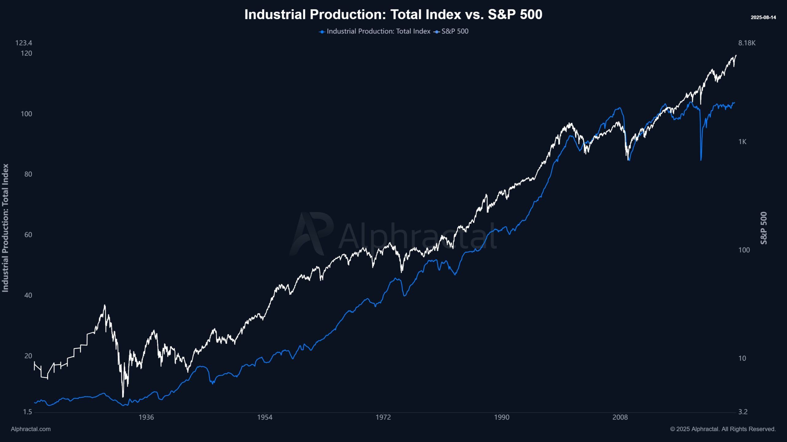 แผนภูมินี้แสดงให้เห็นว่าการเติบโตของการผลิตอุตสาหกรรมชะลอตัวเมื่อเทียบกับแนวโน้มในอดีต แต่ตลาดหุ้นยังคงพุ่งสูงขึ้น ซึ่งบ่งชี้ว่าการฟื้นตัวของวอลล์สตรีทไม่ได้สะท้อนถึงผลผลิตในเศรษฐกิจจริง