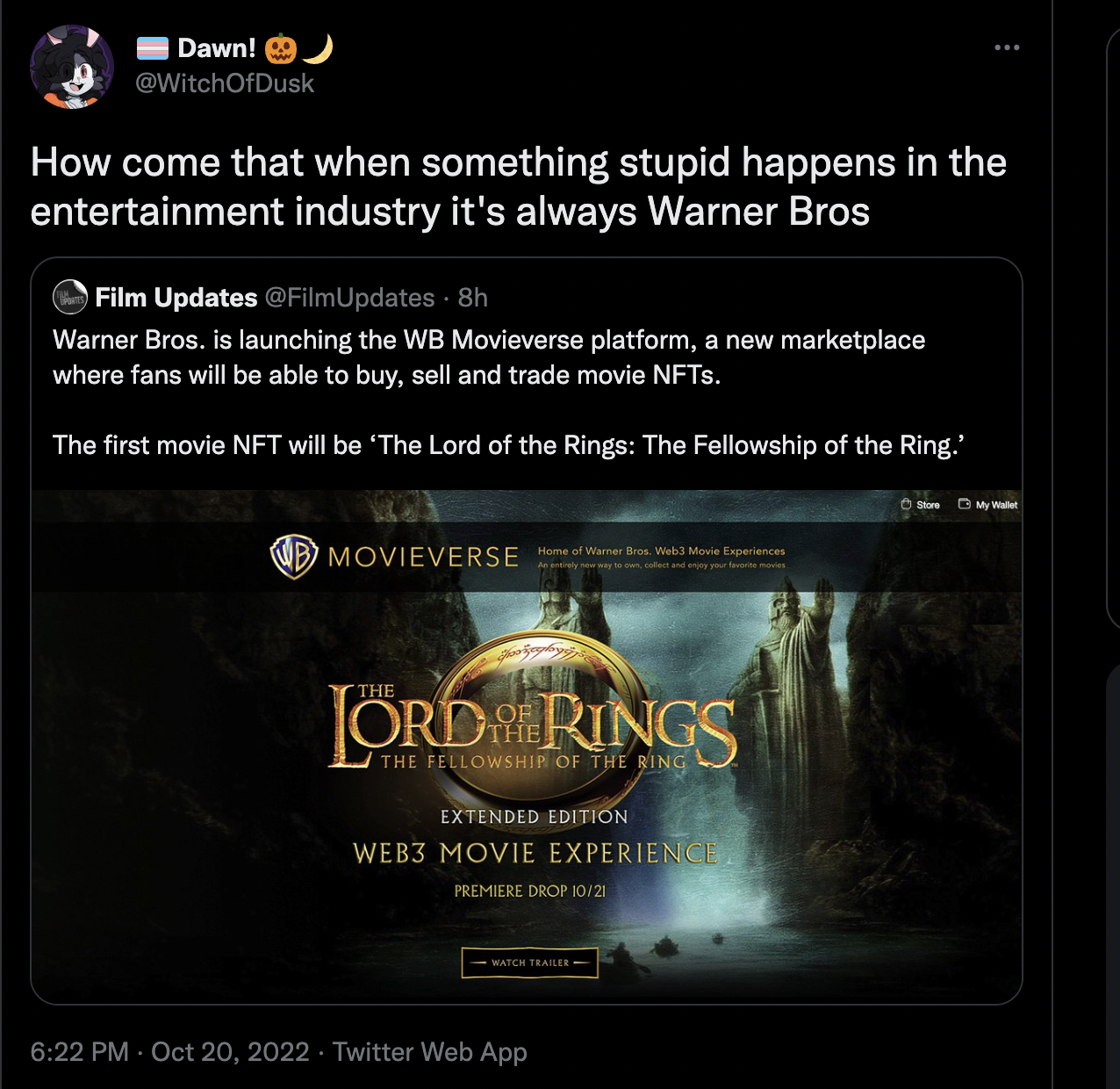 บัญชี Twitter อย่างเป็นทางการของคอลเล็กชัน Warner Bros NFT ประกาศในวันนี้ว่าพวกเขาอยู่ระหว่างการเปิดตัว Web3 Movie Experiece ในรูปแบบที่ไม่เคยเห็นมาก่อน โดย Warner Bros ร่วมมือกับ Eluv.Io ซึ่งเป็นบล็อกเชนที่เน้นการสร้างเนื้อหาสําหรับ Web3