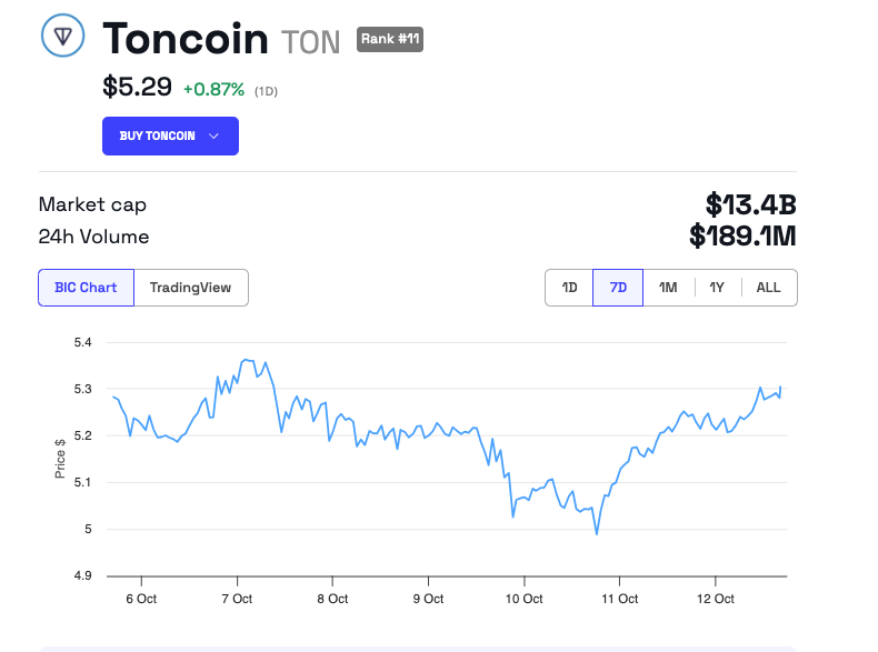แม้จะมีการพัฒนาเหล่านี้ แต่ราคาของ Toncoin (TON) ยังคงคงที่ตลอดสัปดาห์ TON มีการซื้อขายในปัจจุบันที่ 5.29 USD ซึ่งเพิ่มขึ้น 0.87% ใน 24 ชั่วโมงที่ผ่านมา