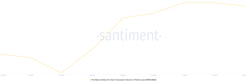 เนื่องจากมูลค่าที่เพิ่มขึ้นในสัปดาห์ที่ผ่านมา เทรดเดอร์ของ PEPE จํานวนมากจึงได้รับผลกําไรจากธุรกรรมของตน อัตราส่วนของปริมาณธุรกรรมบนเครือข่ายรายวันในกําไรต่อขาดทุน ซึ่งประเมินโดยใช้ค่าเฉลี่ยเคลื่อนที่เจ็ดวัน แสดงให้เห็นว่ามีธุรกรรมที่ทํากําไรได้มากกว่าการขาดทุนในสัปดาห์ที่ผ่านมา