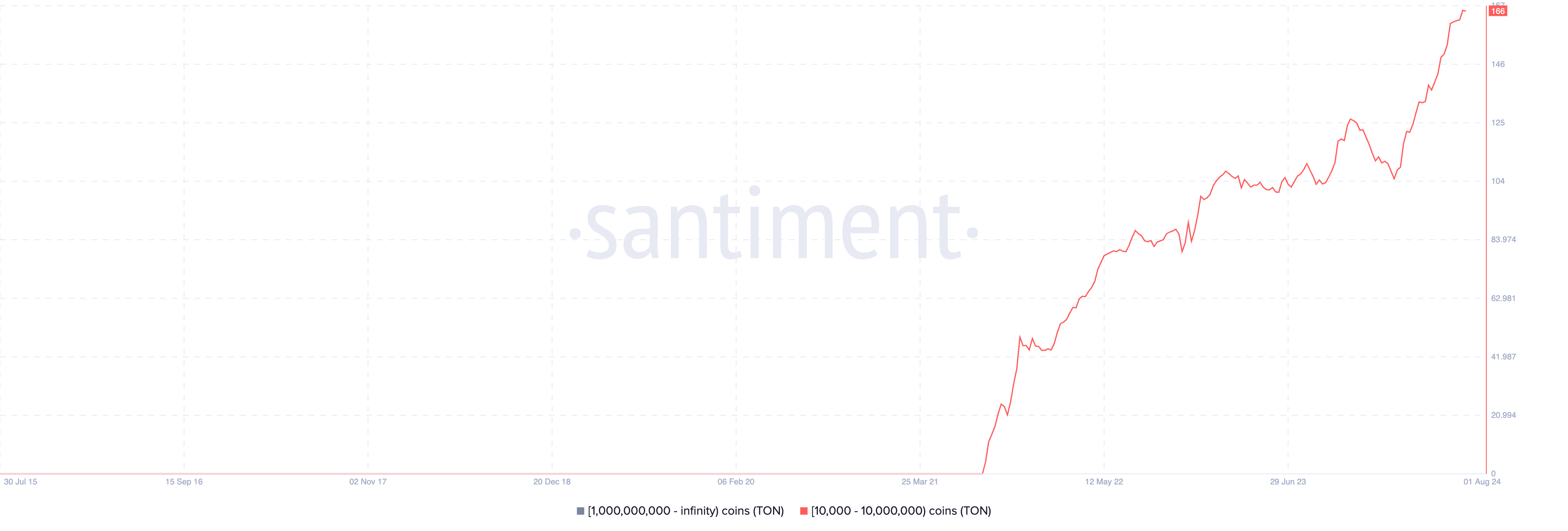 ในฐานะที่หลุมอุกกาบาตราคาของ TON วาฬของมันได้เพิ่มการสะสม จากข้อมูลของ Santiment จํานวนวาฬ TON ที่ถือโทเค็นระหว่าง 100,000 ถึง 10,000,000 โทเค็นเพิ่มขึ้น 2% ในเดือนที่แล้ว จํานวนที่อยู่ที่ประกอบด้วยกลุ่มผู้ถือ TON นี้อยู่ในระดับสูงสุดเป็นประวัติการณ์