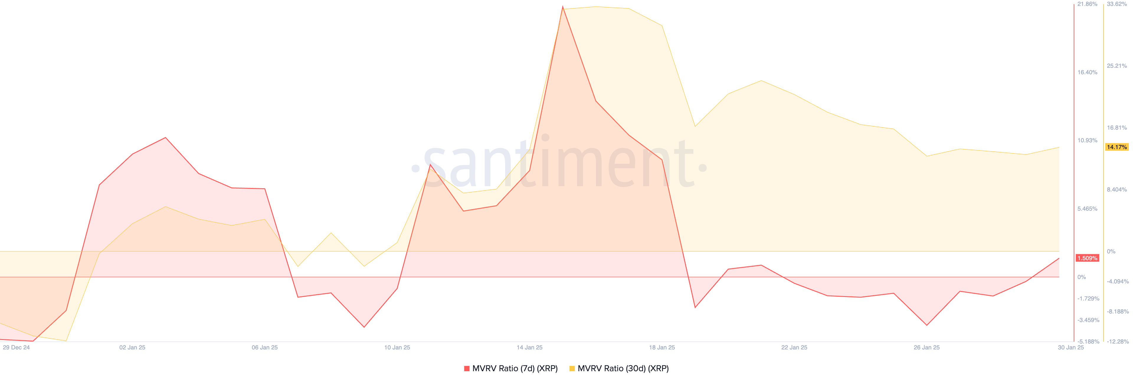 ตัวอย่างเช่น อัตราส่วน Market Value to Realized Value (MVRV) ของ XRP ที่ประเมินผ่านค่าเฉลี่ยเคลื่อนที่หลายตัว บ่งชี้ว่า altcoin นั้นมีมูลค่าสูงเกินไป ซึ่งอาจกระตุ้นให้ผู้ถือขายเพื่อทำกำไร ตามข้อมูลของ Santiment ณ เวลาที่เขียนนี้ อัตราส่วน MVRV เจ็ดวันและ 30 วันของโทเคนอยู่ที่ 1.50% และ 14.17% ตามลำดับ