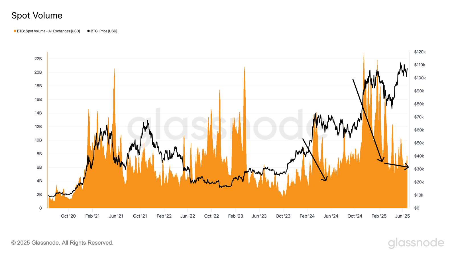บิทคอยน์ได้ซื้อขายใกล้กับจุดสูงสุดตลอดกาล (ATH) โดยคงอยู่เหนือ 100,000 USD ในช่วงสองเดือนที่ผ่านมา อย่างไรก็ตาม ปริมาณการซื้อขายสปอตไม่ได้ตามมาเช่นกัน ไม่เหมือนกับการวิ่งกระทิงครั้งก่อน ระดับราคานี้ไม่ได้กระตุ้นให้เกิดการเพิ่มขึ้นของกิจกรรมการซื้อขาย