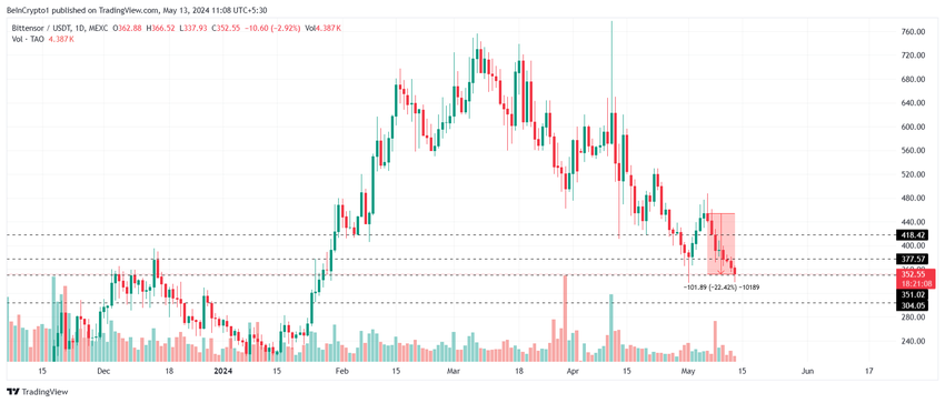 ในช่วงสัปดาห์ที่ผ่านมา ราคา TAO ลดลง 22% ทำให้ altcoin นี้อยู่ที่ราคา 352 ดอลลาร์ ราคา 350 ดอลลาร์ทำหน้าที่เป็นระดับแนวรับทางจิตวิทยาที่สำคัญ และการลดลงต่ำกว่านั้นจะส่ง TAO ไปที่ระดับ 304 ดอลลาร์ ซึ่งเป็นการขยายการปรับฐาน