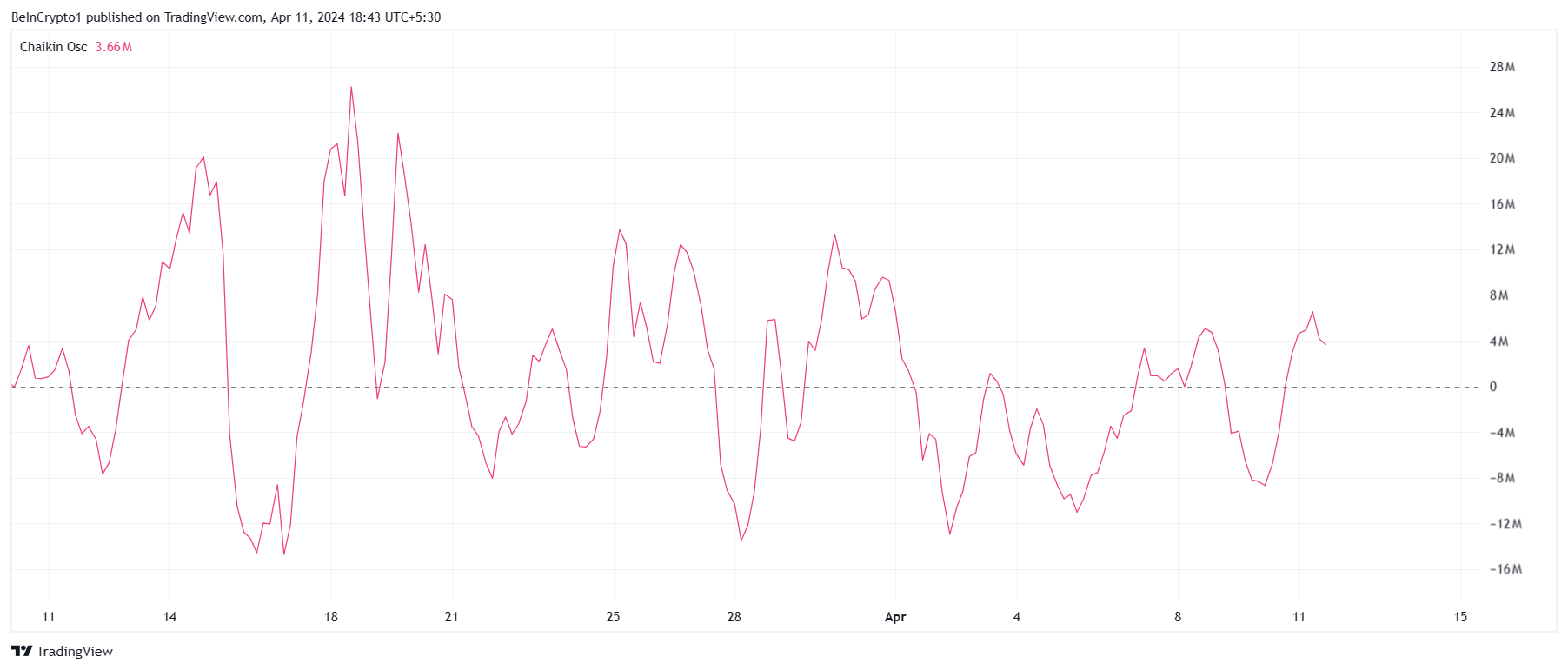 ราคา Dogwifhat (WIF) มีแนวโน้มที่จะเพิ่มขึ้นในอีกไม่กี่วันข้างหน้า เนื่องจากจากนักลงทุนเริ่มให้ความสนใจมันมากขึ้น สิ่งนี้มองเห็นได้อย่างชัดเจนบนตัวชี้วัด Chaikin ซึ่งปัจจุบันอยู่เหนือเส้นศูนย์ขึ้นไปมาก