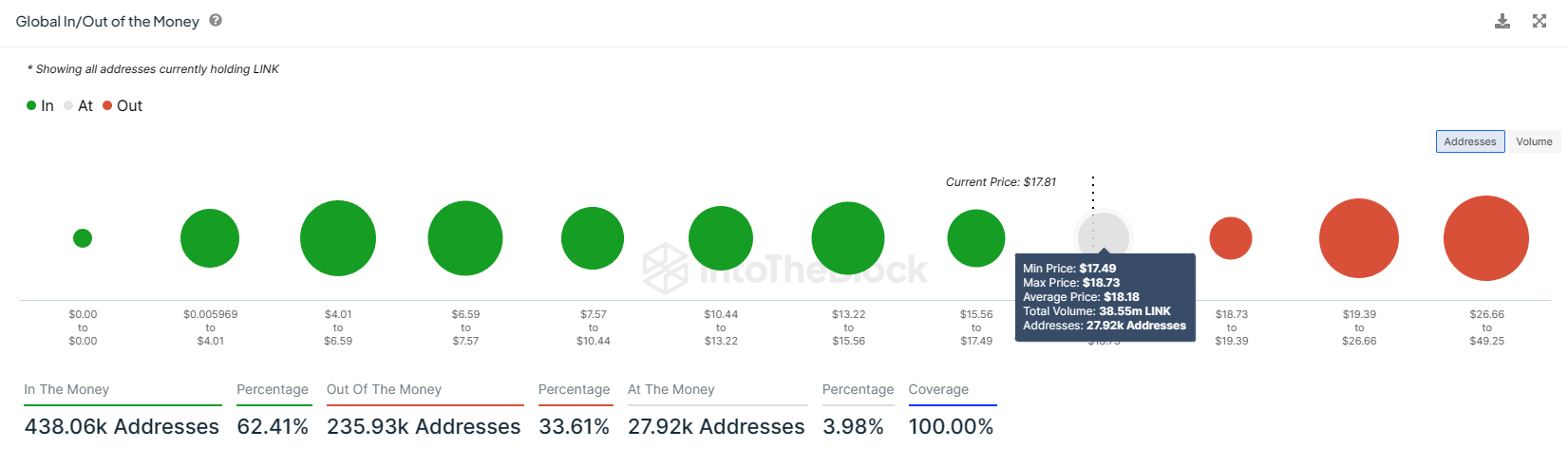 สิ่งนี้เสริมด้วยข้อเท็จจริงที่ว่าโทเค็น LINK เกือบ 38.55 ล้านโทเค็น กําลังเข้าใกล้ จุดที่ทํากําไรได้ อุปทานมูลค่า 684 ล้านดอลลาร์นี้ซื้อระหว่าง 17.49 ถึง 18.73 ดอลลาร์ นักลงทุนจึงเลือกที่จะไม่ขายการถือครองในตอนนี้จนกว่าจะได้รับผลกําไรอีก 684 ล้านดอลลาร์