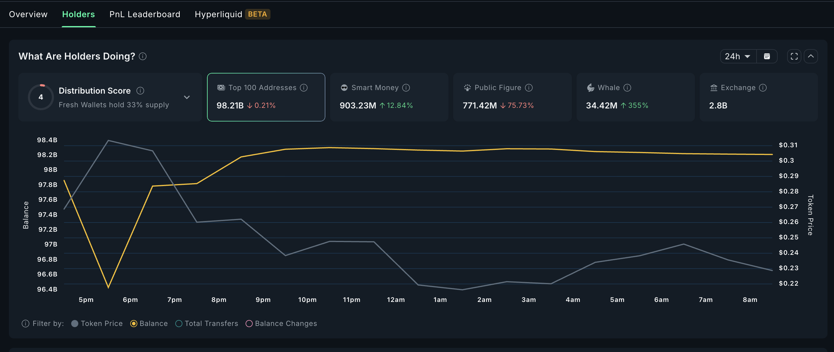 ที่อยู่ 100 อันดับแรกได้ขายออกไปเกือบ 216.54 ล้าน WLFI มูลค่าใกล้เคียง 49.15 ล้าน USD ที่ราคาเฉลี่ย 0.227 Smart Money ได้ซื้อเพิ่มมากกว่า 102.78 ล้าน WLFI ในช่วงเวลาเดียวกัน มูลค่าเกือบ 23.33 ล้าน USD บุคคลสาธารณะซึ่งรวมถึง KOLs ที่รู้จักและบุคคลสำคัญในตลาด ขายออกไปเกือบ 546.40 ล้าน USD