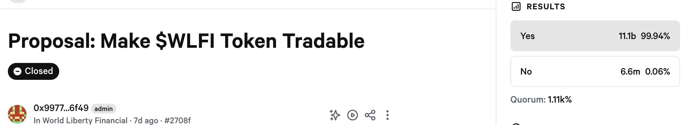 แม้ว่า WLFI จะเป็นโทเค็นการกำกับดูแล แต่ข้อเสนอนี้เป็นครั้งแรกที่ผู้ถือโทเค็นได้ลงคะแนนในหัวข้อที่จริงจัง การตอบสนองของพวกเขาท่วมท้น โดย 99.94% ของผู้ลงคะแนน สนับสนุนมาตรการนี้: