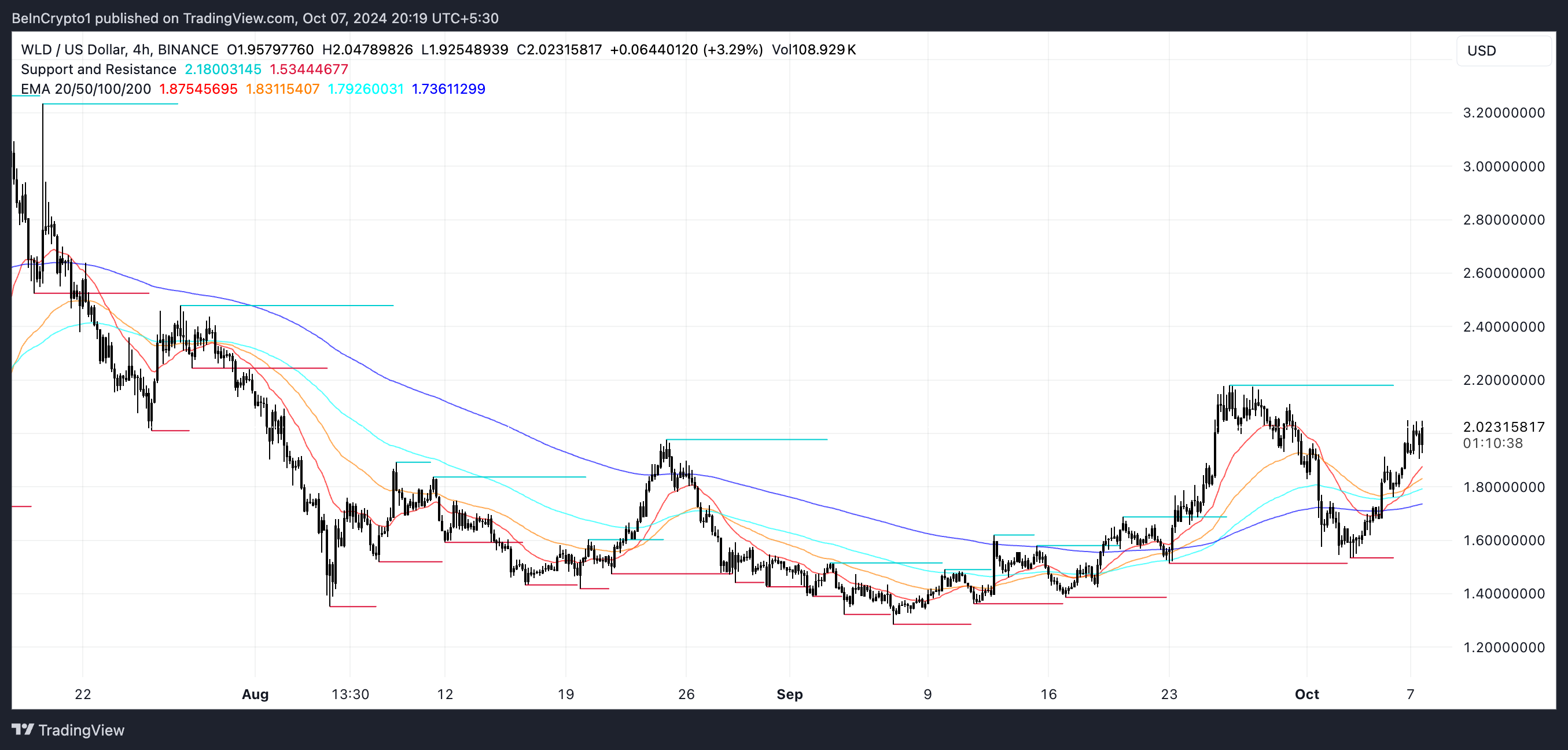 เส้น EMA (Exponential Moving Average) ของ WLD ในปัจจุบันดูเป็นกระทิง โดยที่เส้น EMA ระยะสั้นทั้งหมดอยู่เหนือเส้นระยะยาว ในวันที่ 6 ตุลาคม เส้นเหล่านี้ได้ก่อตัวเป็น golden cross ซึ่งเป็นตัวบ่งชี้ทางเทคนิคที่เกิดขึ้นเมื่อเส้นเฉลี่ยเคลื่อนที่ระยะสั้นข้ามเหนือเส้นเฉลี่ยเคลื่อนที่ระยะยาว ส่งสัญญาณถึงแนวโน้มที่มีศักยภาพสูง