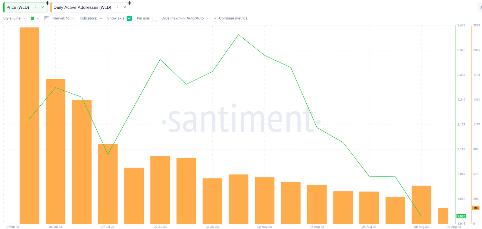 จากข้อมูลของ Santiment ผู้ใช้งานที่ใช้ WLD ในการทำธุรกรรมรายวันลดลงอย่างมาก ดังที่แสดงให้เห็นด้านล่าง Worldcoin มีกระเป๋าที่ใช้งานอยู่เพียง 440 ที่อยู่ในวันที่ 8 สิงหาคม สิ่งที่น่ากังวลคืออัตราธุรกรรมรายวันลดลง 80% จากที่อยู่ที่ใช้งานอยู่ 2,272 รายการที่บันทึกไว้ในวันที่เปิดตัววันที่ 24 กรกฎาคม 2023