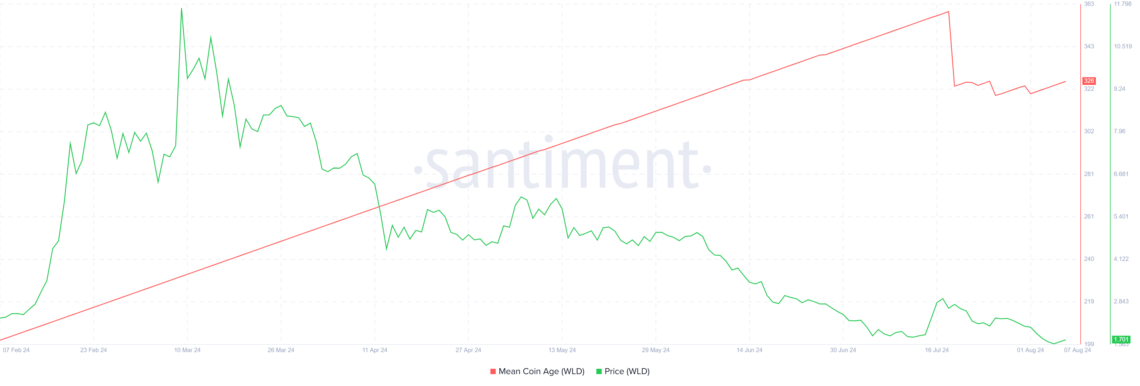 โดยทั่วไป การเพิ่มขึ้นบ่งชี้ถึงการ HODLing ที่สม่ำเสมอ ในขณะที่การลดลงส่งสัญญาณการเคลื่อนไหวของอุปทานที่เพิ่มขึ้นระหว่างที่อยู่ หลังจากผ่านไปสองสามวันในช่วงปลายเดือนกรกฎาคม ซึ่งหมายความว่าความ เชื่อมั่นในหมู่ผู้ถือ WLD กําลังดีขึ้นเมื่อราคาลดลงหยุดลง