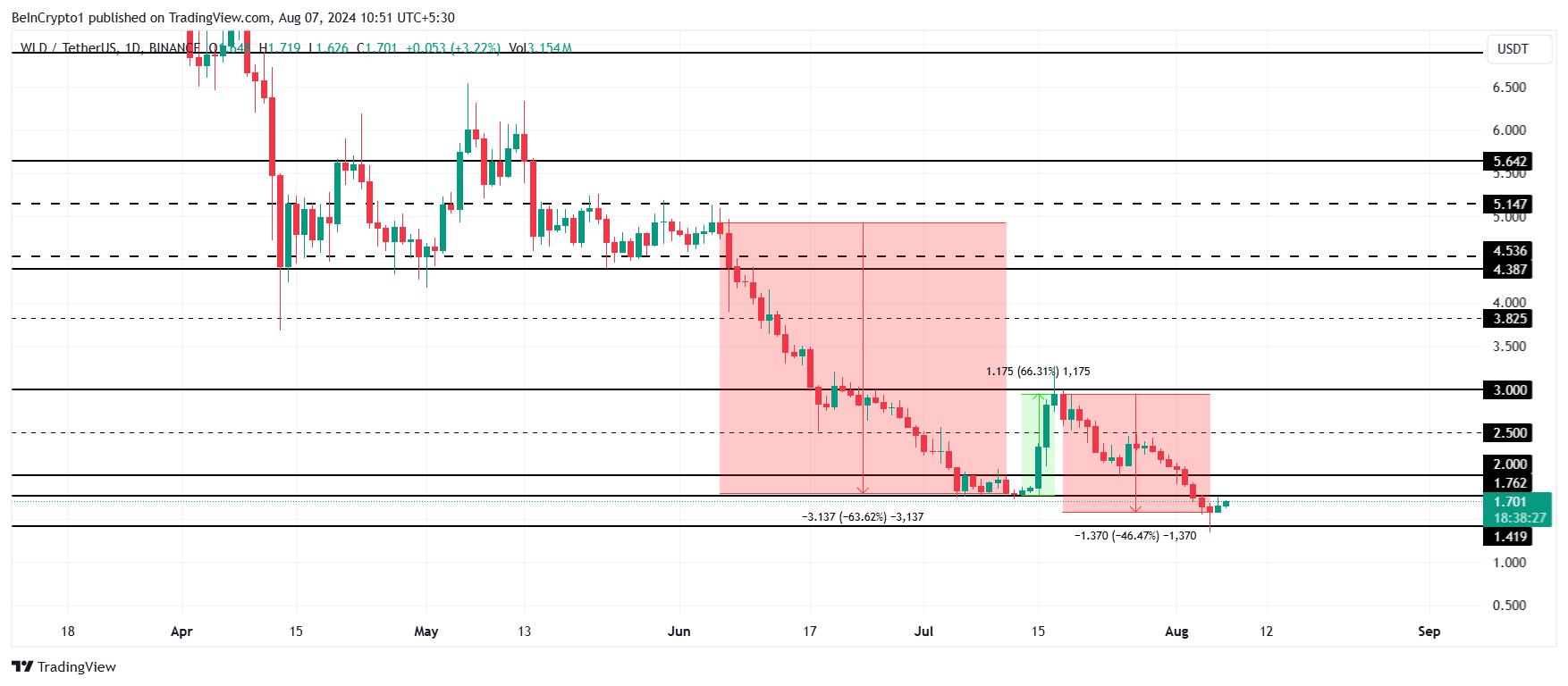 หลังจากลดลง 63% ตลอดเดือนมิถุนายนและครึ่งเดือนกรกฎาคม ราคาของ Worldcoin พยายามเรียกคืน การขาดทุน เมื่อ WLD เพิ่มขึ้น 66% ตลาดก็เปลี่ยนเป็นขาลง และในช่วงสามสัปดาห์ altcoin ก็ลดลงอีก 46%