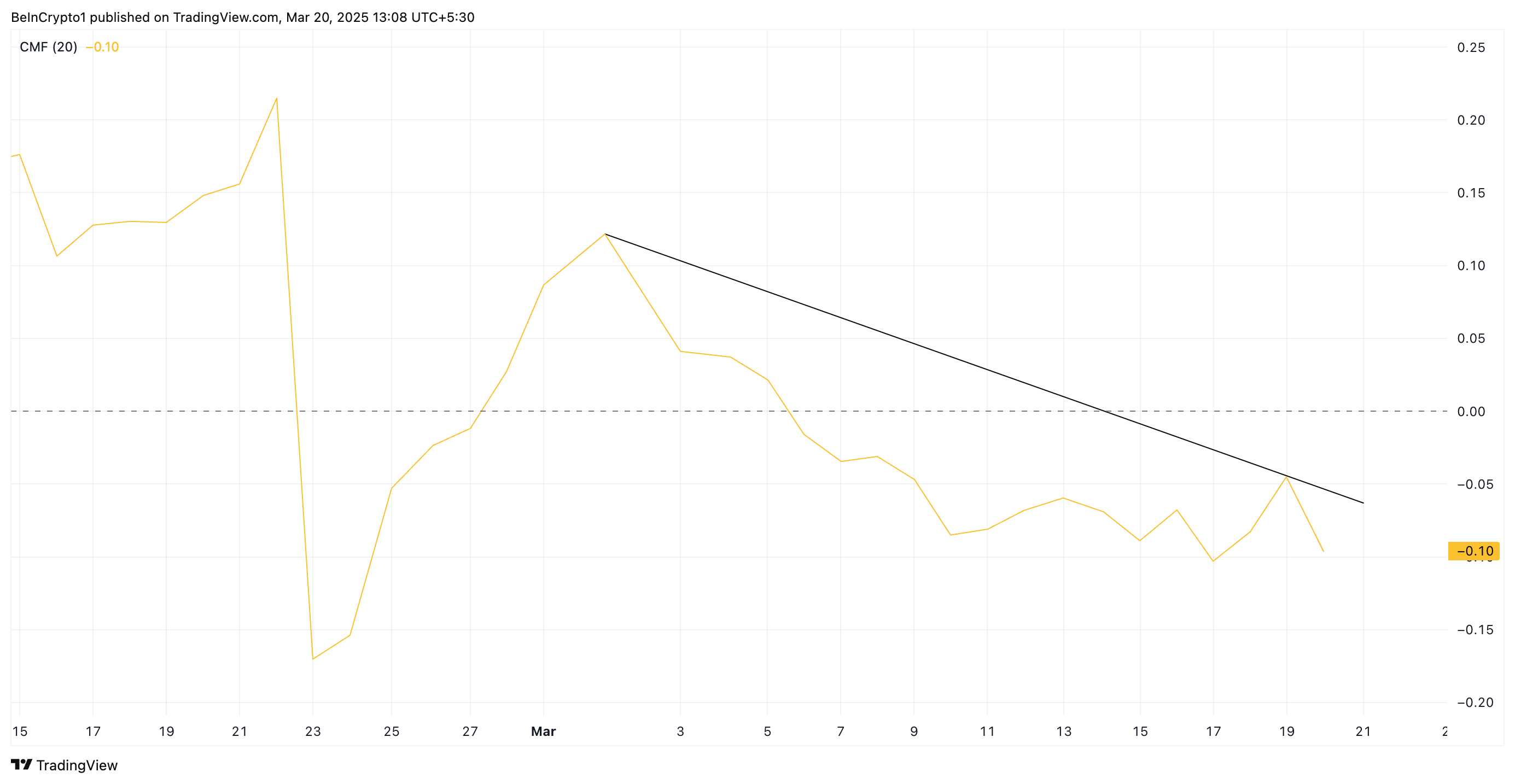 แนวโน้มนี้เกิดขึ้นเมื่อราคาของสินทรัพย์เพิ่มขึ้นในขณะที่ CMF ลดลง ซึ่งบ่งชี้ว่านักลงทุนจำนวนน้อยลงสนับสนุนการขึ้นด้วยการไหลเข้าของเงินทุนจริง ดังนั้นแนวโน้มขาขึ้นอาจไม่ยั่งยืน เพิ่มความเสี่ยงของการกลับตัว