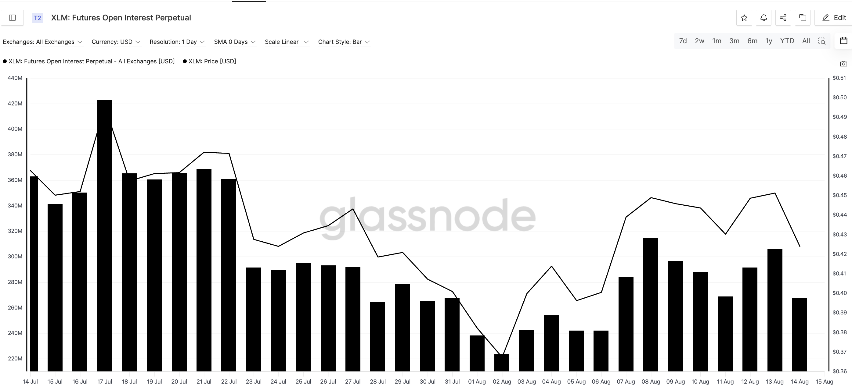 ในตลาดอนุพันธ์ เรื่องราวก็คล้ายกัน ความสนใจเปิดของฟิวเจอร์สของ Stellar ลดลงอย่างต่อเนื่อง จากประมาณ 420 ล้าน USD ในกลางเดือนกรกฎาคมถึงประมาณ 260 ล้าน USD ในขณะนี้