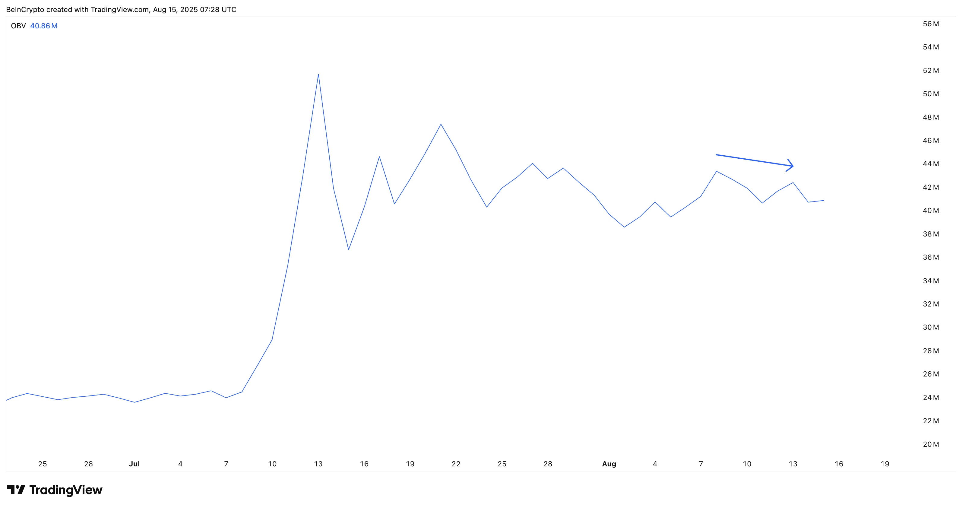 สัญญาณเตือนแรกคือการมีส่วนร่วมในตลาด ในขณะที่ ราคาของ XLM ทำจุดสูงสุดใหม่บนกราฟราคา (ระหว่างวันที่ 8 สิงหาคมถึง 13 สิงหาคม) On-Balance Volume (OBV) พิมพ์จุดสูงสุดที่ต่ำกว่า ซึ่งบ่งชี้ว่าความสนใจในการซื้อสปอตไม่ได้ตามแรงผลักดันเดียวกัน ความแตกต่างนี้บ่งชี้ว่าการชุมนุมถูกพบด้วยแรงกดดันในการซื้อน้อยลง จำกัดความยั่งยืน