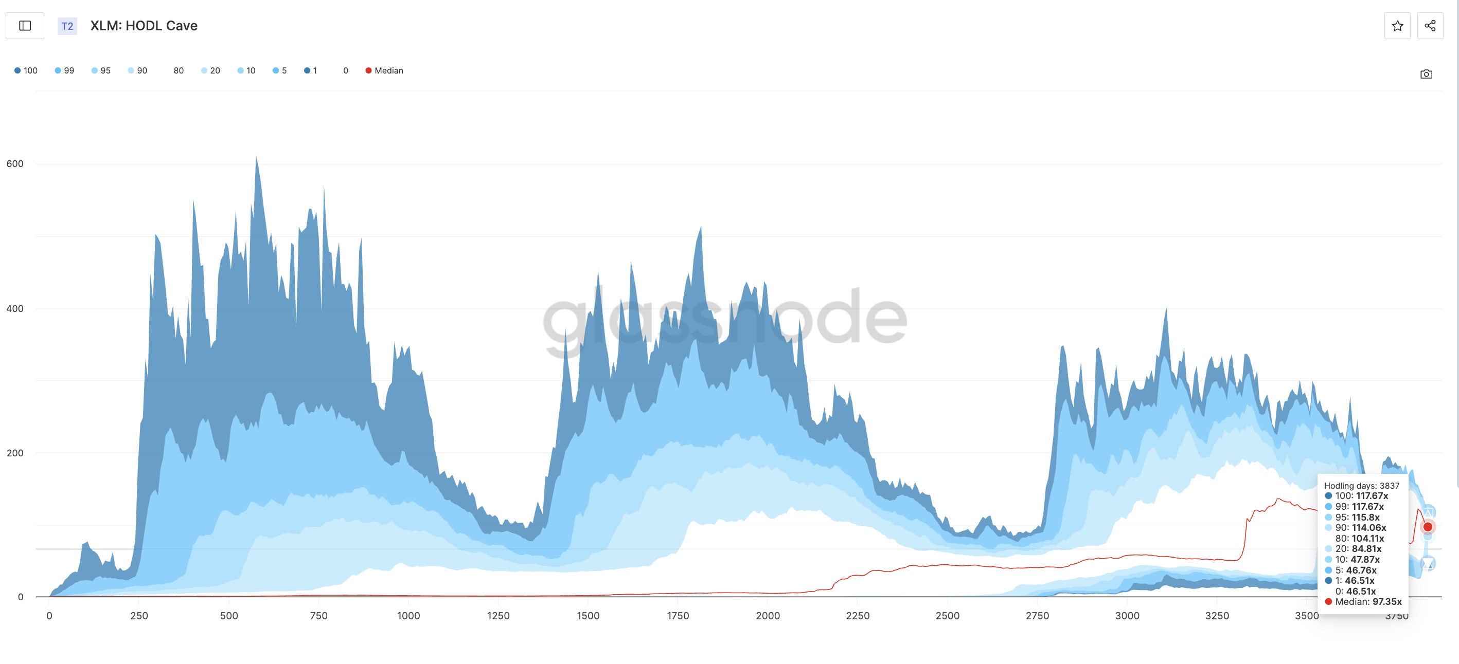 ตัวชี้วัด HODL Cave แสดงการกระจายของผลตอบแทนในอดีตสำหรับผู้ถือ XLMในเปอร์เซ็นไทล์ต่างๆ ณ จุดเวลาปัจจุบัน (วันที่ 3,837)