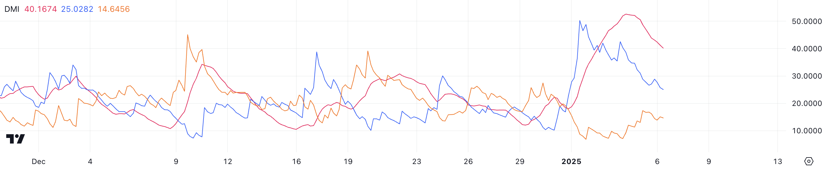 +DI ซึ่งแสดงถึงแรงกดดันในการซื้อ ลดลงเหลือ 25 จาก 40.3 เมื่อสองวันก่อน ขณะที่ -DI ซึ่งติดตามแรงกดดันในการขาย เพิ่มขึ้นเป็น 14.6 จาก 7.9