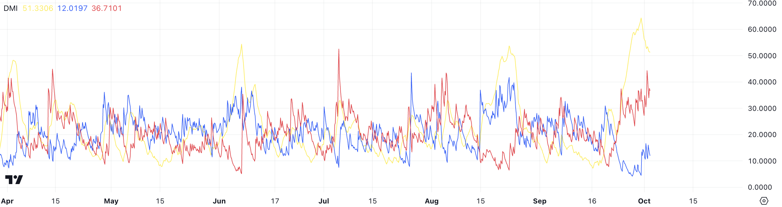 ADX เป็นตัวชี้วัดสำคัญที่ใช้ในการประเมินความแข็งแกร่งของแนวโน้มไม่ว่าจะเป็นขาขึ้นหรือขาลงและบอกว่ามันแข็งแกร่งหรือไม่ DMI ประกอบด้วยสามเส้น ADX +DI ซึ่งสะท้อนถึงแรงกดดันในการซื้อหรือแรงกดดันขาขึ้น และ -DI ซึ่งวัดแรงกดดันในการขายหรือแรงกดดันขาลง