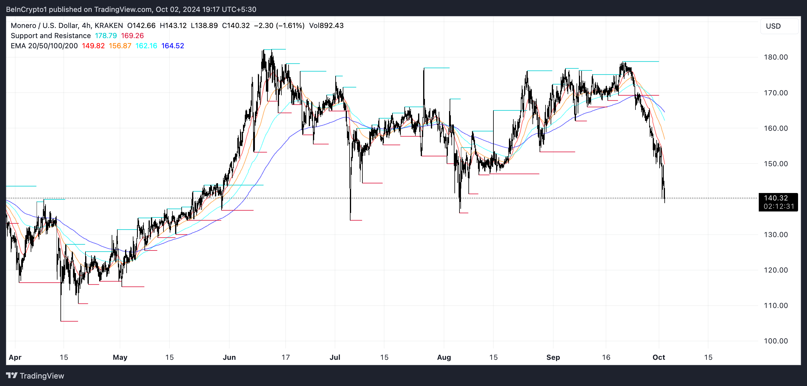 เมื่อวันที่ 24 กันยายน Monero XMR ได้รับสัญญาณขาลงเมื่อเส้น EMA ของมันได้ก่อตัวเป็น Death cross หลังจากนั้นราคาของมันก็ลดลง 22%