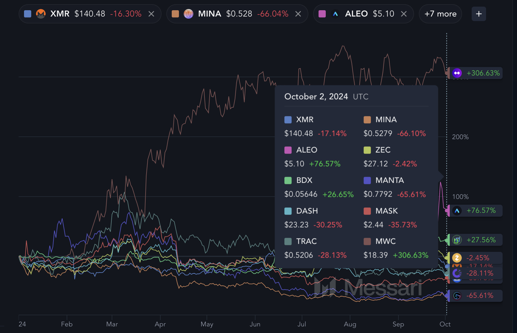 ปี 2024 ดูเหมือนจะเป็นปีที่ท้าทายสำหรับ Privacy coins โดยมีเพียงสามในสิบอันดับแรกที่แสดงผลตอบแทนเป็นบวก Privacy coins ยังคงเป็นพื้นที่ที่ซับซ้อนยิ่งขึ้นในพื้นที่ Crypto และมักมีมูลค่าต่ำกว่าภาคส่วนอื่น ๆ ในหมู่ 10 อันดับแรกของ Privacy coins มีเพียง Monero XMR เท่านั้นที่มีมูลค่าตลาดมากกว่า 1 พันล้านดอลลาร์ โดยเฉพาะอย่างยิ่ง 2.6 พันล้านดอลลาร์