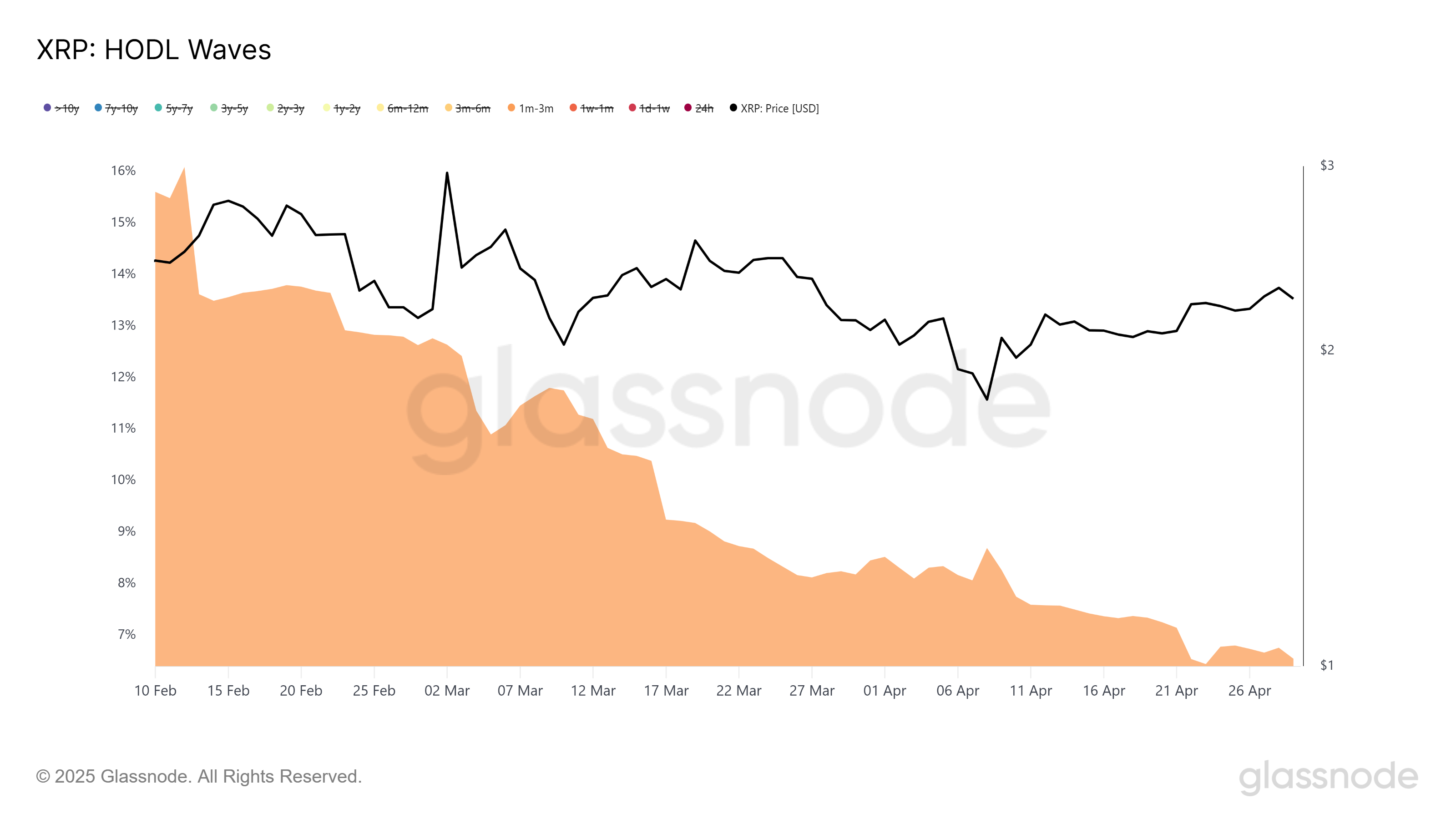การครอบงำของผู้ถือครองระยะสั้นลดลงอย่างมาก ซึ่งบ่งชี้ถึงการเปลี่ยนแปลงใน พลวัตของตลาดสำหรับ XRP ตามข้อมูล HODL waves อุปทานที่ถือโดยนักลงทุนที่ถือครองระหว่าง 1 ถึง 3 เดือนลดลงจาก 12% เหลือ 6% ในช่วงสองเดือน