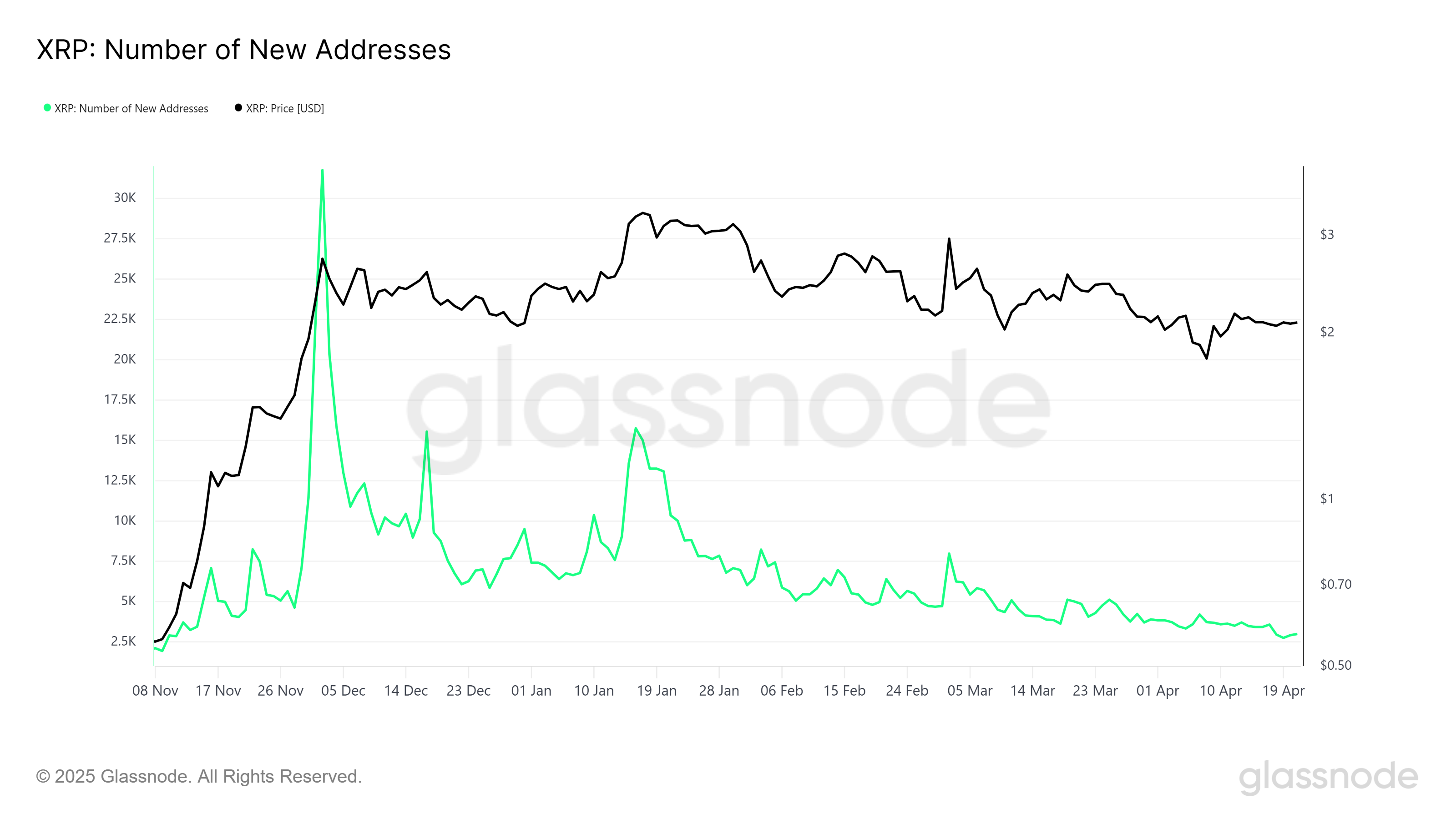 ที่อยู่ใหม่ที่เกี่ยวข้องกับ XRP ได้ลดลง สู่ระดับต่ำสุดในรอบ 5 เดือน ซึ่งบ่งชี้ถึงการลดลงของความสนใจจากนักลงทุนใหม่ นี่แสดงให้เห็นว่า XRP กำลังสูญเสียแรงดึงดูดในตลาดเนื่องจากเงินทุนใหม่ไม่ไหลเข้าสู่สินทรัพย์ การขาดผู้ซื้อใหม่อาจทำให้ XRP รักษาตำแหน่งเหนือ 2 USD ได้ยาก