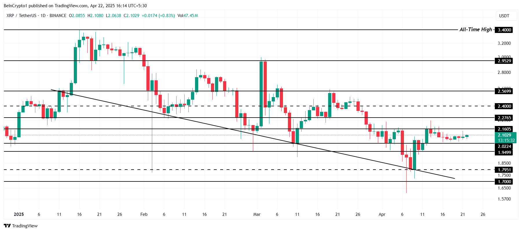 ราคาของ XRP ปัจจุบันอยู่ที่ 2.10 USD โดยยังคงอยู่เหนือระดับสนับสนุนที่ 2.02 USD แต่เผชิญกับแนวต้านที่ 2.16 USD แนวโน้มขาลงที่ดำเนินมาตั้งแต่ต้นปี ยังคงส่งผลกระทบอย่างหนักต่อ altcoin นี้ หากราคายังไม่สามารถทะลุแนวต้านได้ XRP อาจพยายามดันราคาขึ้นสูงกว่าเดิม