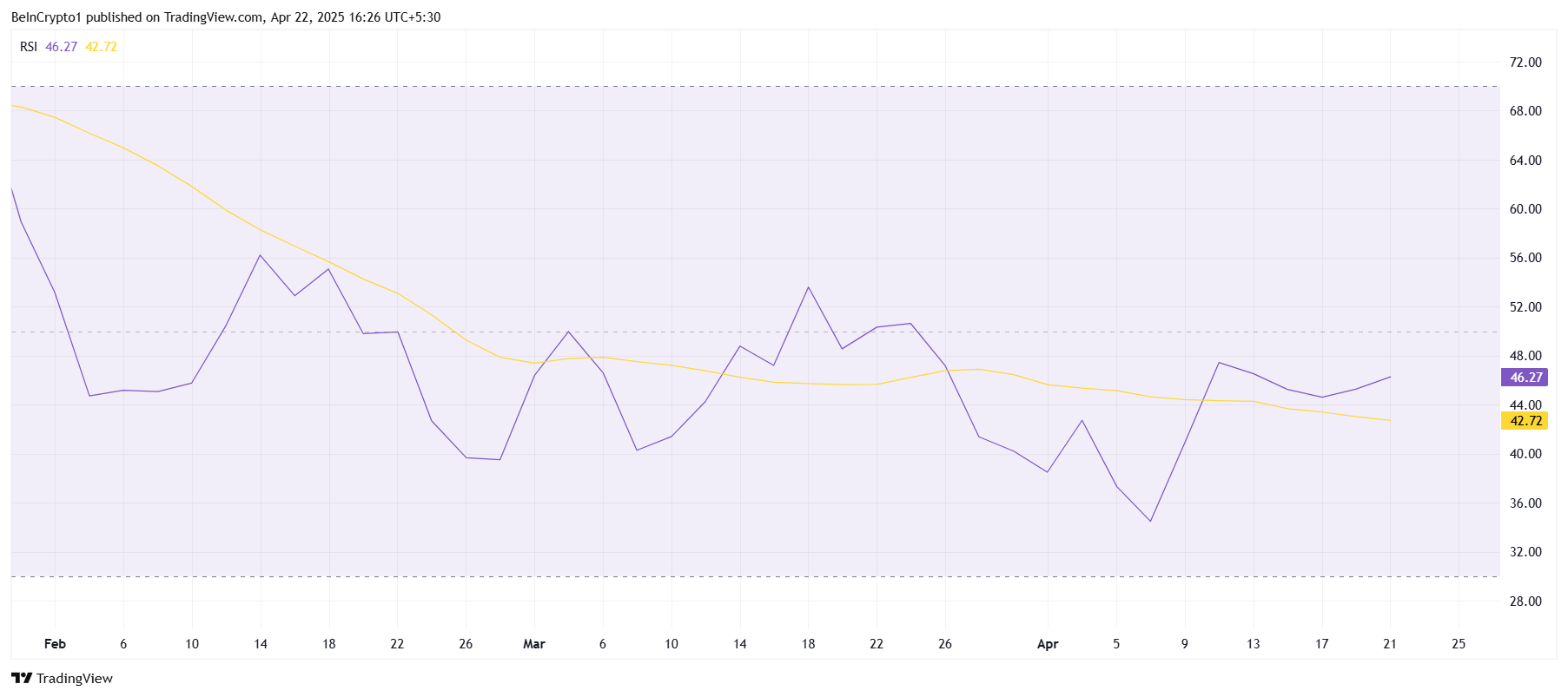 โมเมนตัมมหภาคโดยรวมสำหรับ XRP ยังคงอ่อนแอ สะท้อนจากตัวชี้วัดทางเทคนิคเช่น RSI ปัจจุบันติดอยู่ต่ำกว่าระดับกลางที่ 50.0 RSI บ่งชี้ว่า XRP ยังคงอยู่ในโซนขาลง ซึ่งแสดงถึงการขาดโมเมนตัมขาขึ้น ซึ่งอาจป้องกันไม่ให้ altcoin เห็นการชุมนุมที่สำคัญในระยะสั้น