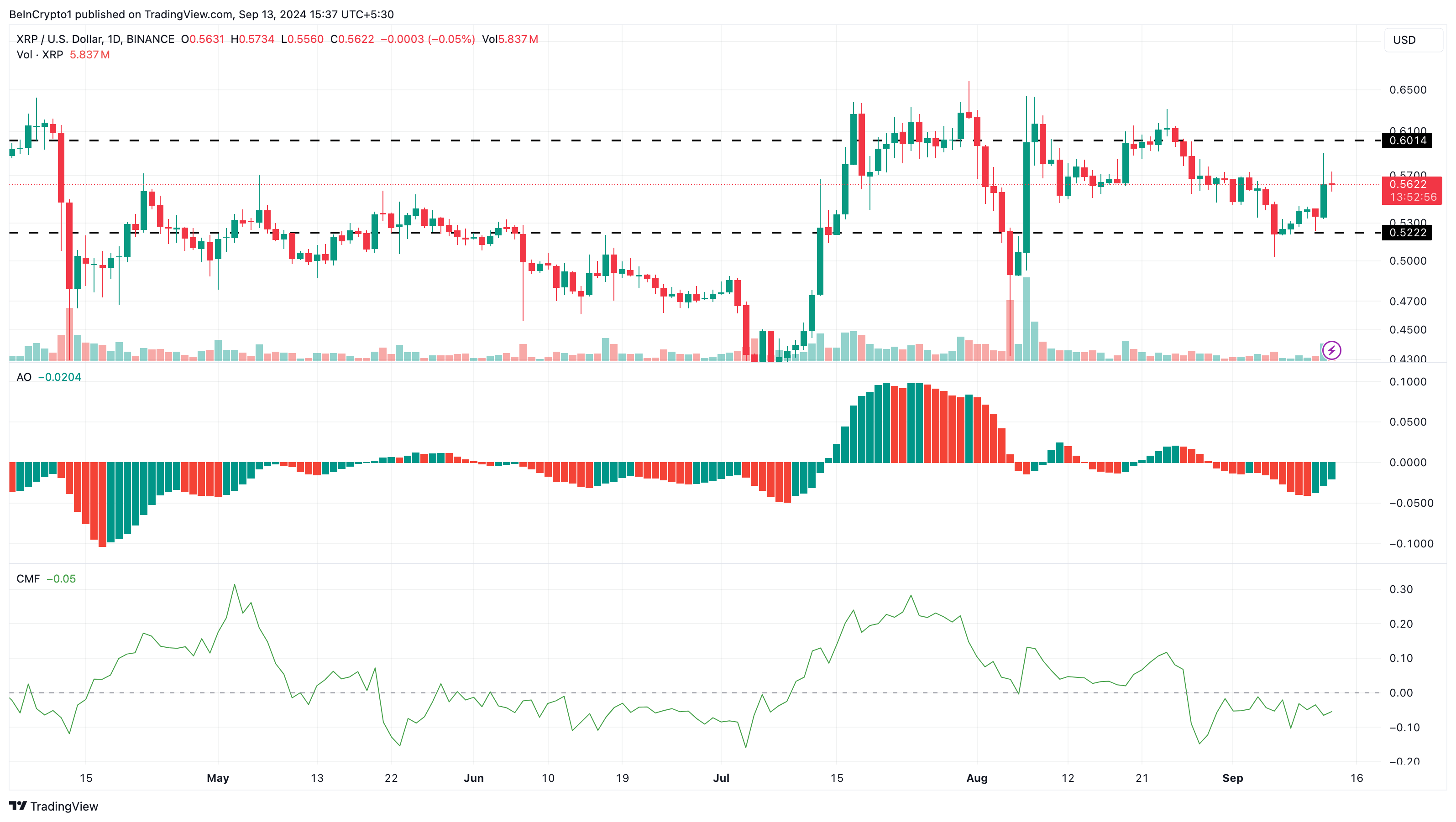 การอ่าน CMF ที่เป็นลบนี้บ่งชี้ว่าการกระจายของ XRP ยังคงมากกว่าการสะสม ซึ่งบ่งบอกถึงการลดลงของราคาที่อาจเกิดขึ้น ในทำนองเดียวกัน Awesome Oscillator (AO) ก็อยู่ในเขตลบ แม้ว่าจะแสดงแถบฮิสโตแกรมสีเขียว
